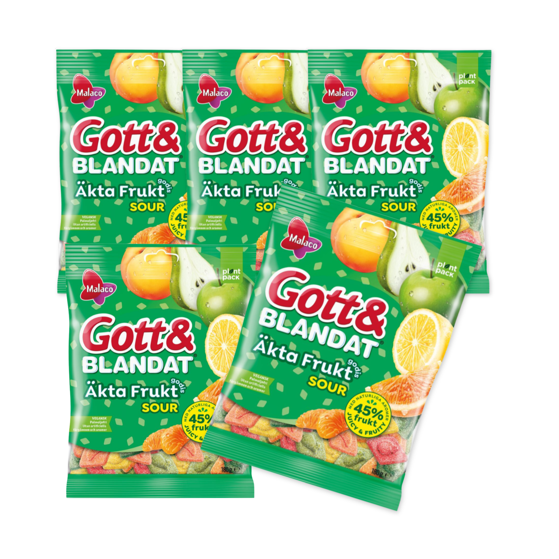 Malaco Gott & Blandat Genuine Fruit Candy Sour contains as much as 45% fruit from fruit puree and fruit juices, giving the candy a naturally juicy and fruity taste. The product is vegan and contains only natural colors and flavors. Gott & Blandat authentic fruit candy Sour contains sour-sanded candy pieces with different flavors; lemon, peach, pear, mandarin, orange and apple. The bag contains 90 grams. 45% fruit - 100% taste!