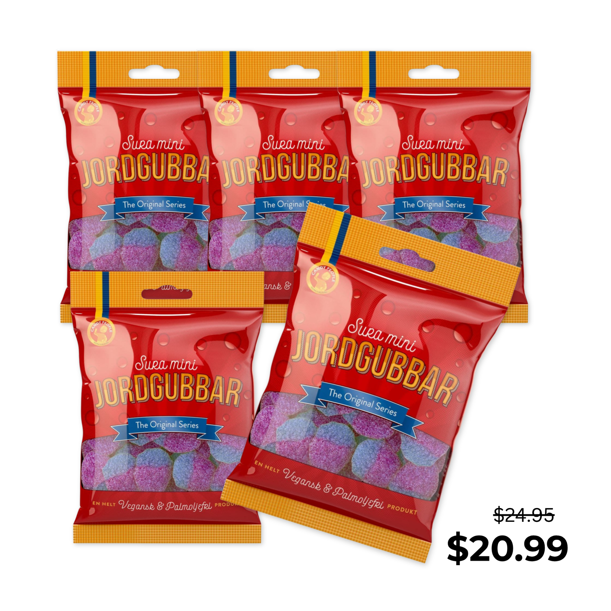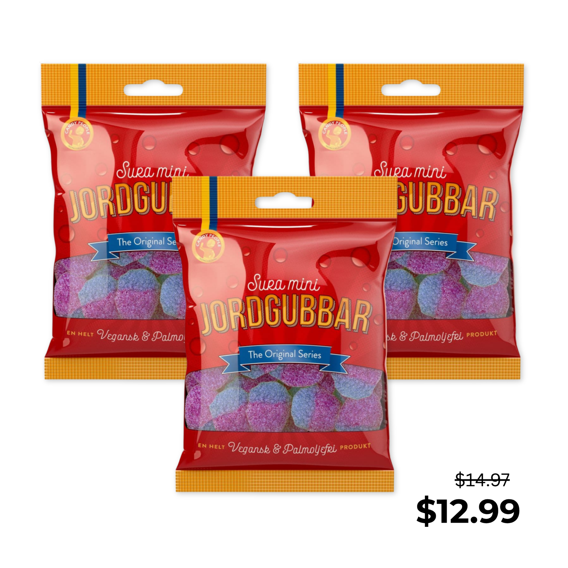 Sura Mini Jordgubbar is a sour strawberry flavoured sugared jelly from Sweden. The Sura Mini Jordgubbar sweets are gelatin and palm oil free and they are also completely vegan. Enjoy them yourself or bring some fun to a friend’s day!