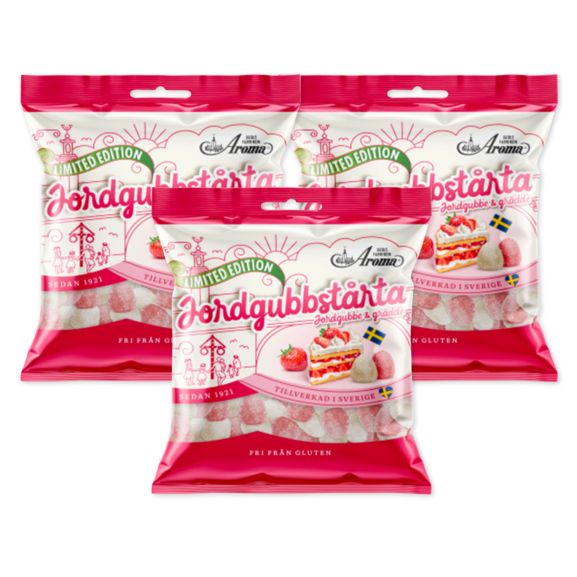 Aroma Strawberry Cake are small, sweet, sugar-coated jelly tops with a vanilla cream and strawberry flavor. These colorful candies combine the creamy sensation of vanilla with summery strawberries to recreate the taste experience of classic strawberry cake. A nostalgic and delicious candy variety that evokes memories of summer celebrations.